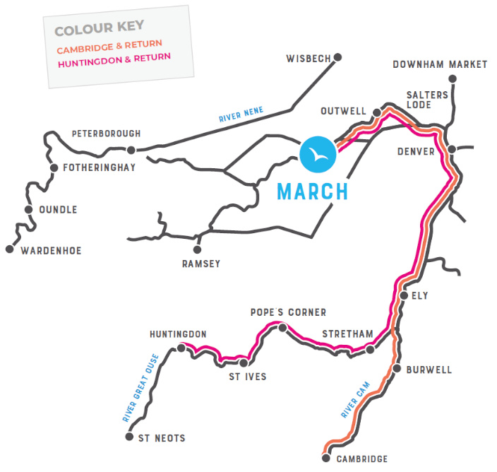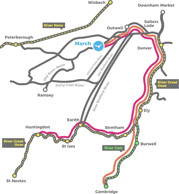 Denne rute tager vandrejsende på en rejse med masse af historie og dyreliv - fra byen, der engang var en ø, gennem stille farvande og en bred himmel, på eventyr gennem den mægtige Denver Tidal Sluice og videre til Cromwells hjemområde i Ely.