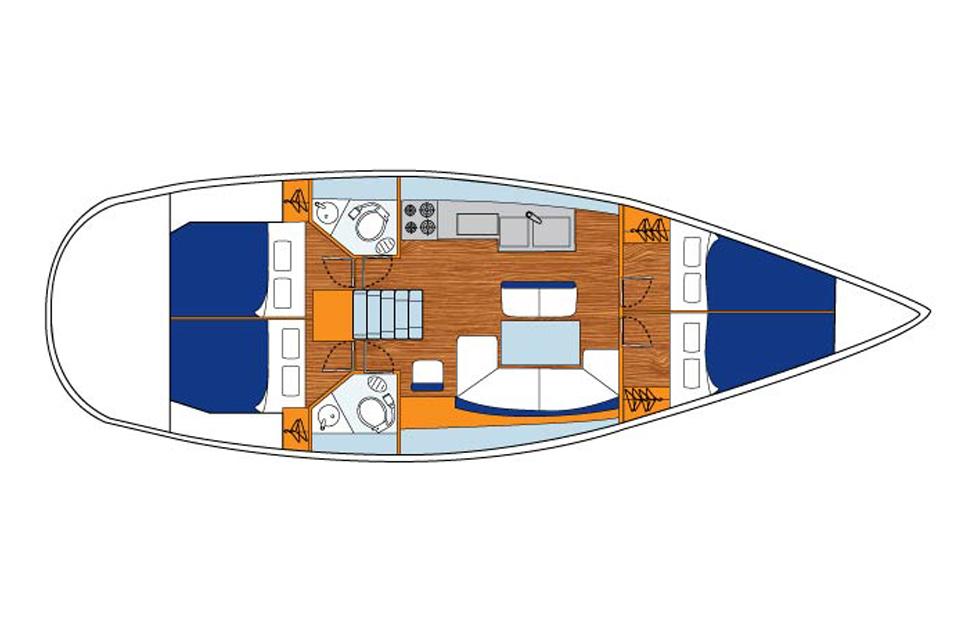 Indvendig byder det moderne interiør på en stor saloon, med et bord der også kan konverteres til en dobbeltkøje, og et fuldt udstyret pantry. Luger og lange saloon-vinduer giver masser af lys og ventilation – denne Jeanneau 44i har 4 kabiner og 2 toiletter.