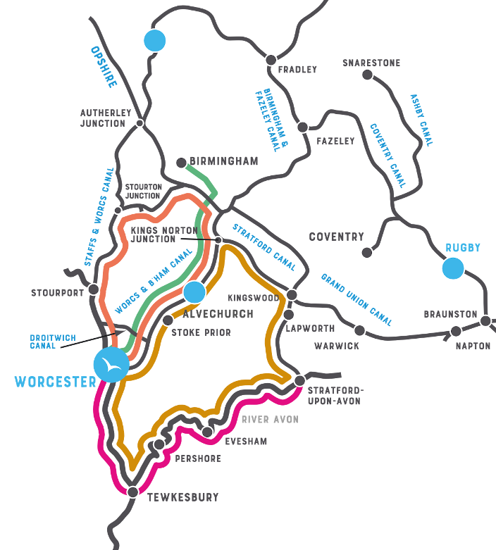 I området ved Birmingham er der rig mulighed for at finde den rute, der passer dig. Her er der tre baser at tage udgangspunkt i. Fra Gailey Wharf får du et varieret sejlområde med et fint mix mellem det landlige England og bykultur. Langs strækningen er der rig mulighed for at finde familievenlige aktiviteter. Den anden base ligger i Alvechurch Marina – i hjertet af et meget varieret kanalnetværk i Midlands. Sidste base ligger ved Worcester, hvor Severn-floden løber igennem.