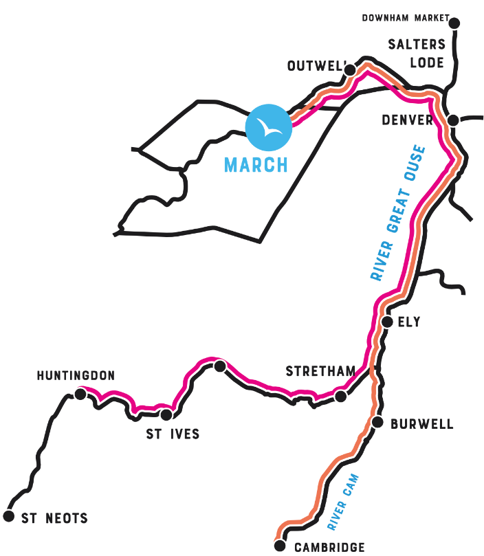 Med udgangspunkt i ABC Boat Hire’s base i March, kan du sejle på bådoperatørens mest østligt placerede base i England. Basen i March ligger lige midt imellem floderne Ouse og Nene, med mulighed for en afstikker til Cam-floden.