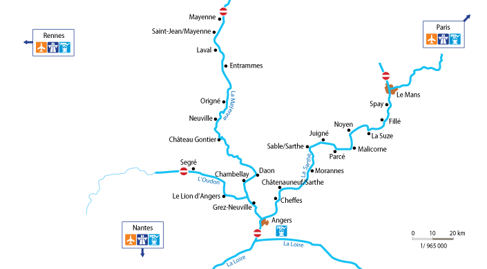 Fra basen i Grez-Neuville er floden kantet af små landsbyer, herresæder og gamle møller, der nærmest hviler op ad flodens skråninger. Stands op i kunstbyen Angers, Kong Renés stad eller ved klosterkirken i Entrammes, hvor også de berømte Port Salut-oste fremstilles. Kunstmuseet i byen Laval er også et besøg værd.