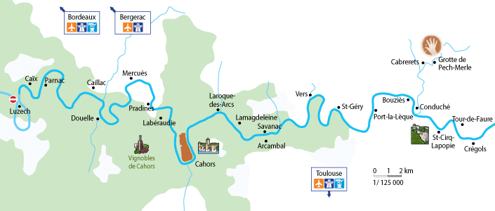 Floden er Frankrigs 7. længste flod - 491 km. Det er en bjergflod og flodlejet er smalt og der er kun nogle få og mindre bifloder. Der kan i for- og eftersæsonen være høj vandstand og ved nogle af slusehusene er afmærket, hvor høj vandstanden har været i f.eks. 1842 og 1912. I 1926 blev floden faktisk lukket for sejlads i omkring 60 år, men i 1989 blev den genetableret stykke for stykke og er nu åben for sejlads i det angivne område. Fortrinsret: nogle steder er floden smal og der er nogle regler, som skal overholdes i forhold til lystbåde og erhvervsbåde, om man sejler med eller modstrøms m.m. men det vil alt blive forklaret på basen. Foran hver dæmning vil der være signal og bøjer, som tilkendegiver sejladsgrænserne – overhold disse da strømmen kan være meget stærk. Lægger du til ved bredderne kan være smukt med picnic-borde m.m. Der er et fint afsnit omkring sejladsens historie på Lot-floden – allerede under romerne blev floden brugt til transport. Lot-floden løber gennem det officielle Cahor-vindistrikt og man kan se mange kajsteder, som blev brugt til at laste vintønder på fragtbådene og disse steder vidner om flodens betydning for den kommercielle trafik. Der er både mindre vingårde og nogle få store vinslotte, som gerne åbner deres dør for besøgende – herunder dronningen og prinsens eget slot Caïx. Ved byen Nicols kan man få båden fra Lot-floden til Baïse-floden, men man skal have en professionel lods ombord for at udføre denne manøvre. I bogen finder du desuden detaljerede udsnit af et bestemt kanalafsnit og en turistbeskrivelse af afsnittet på engelsk, tysk og fransk. Bogen indeholder også mange nyttige oplysninger for sejlads i området f.eks. slusernes åbningstider, signaler, fartgrænser, nyttige adresser og telefonnumre til turistkontorer, markedsdage, museer m.m. samt en masse praktiske oplysninger for en sejlads på floden. Flodens krystalklare vand har også andre aktiviteter - man kan bl.a. svømme i floden. Bogen er rigt illustreret med fotos af kanalerne, turiststeder m.m. Bogen findes om bord på båden, men rigtig mange bestiller den på forhånd til forberedelse af bådferien og for at have den som scrapbog til minde om bådferien.
