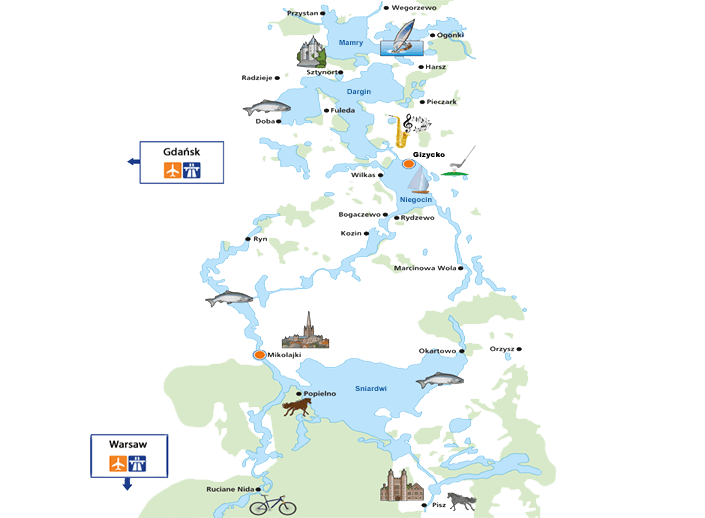 Tillægningssteder - de populære byer - især Mikolajki og Sztynort kan være travle i højsæsonen. Det er en god idé at ringe i forvejen og reservere plads, især hvis du gerne vil i ligge i nærheden af bycentrum, caféer eller forretninger eller hvor der sker noget. Marinaen i Mikolajki har forretninger, barer og restauranter.
