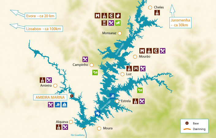 Alentejo-regionen er halvtør og solrig og landbrug, vindyrkning og mindre industri har været hovedindtægten for områdets beboere. Der er allerede bygget en velfungerende marina i Amiera, som tilbyder alle slags bådservice og er base for vores bådudlejning i Portugal. Da turisme i Alentejo-regionen har været meget begrænset indtil nu, kan turisterne opleve et helt andet Portugal langt væk fra turiststedernes normale strålende lys og travle feriebyer. Befolkningen i de små landsbyer her møder turisten med venlighed, og byerne er stadig små samfund med deres egne maleriske kirker og befæstninger. De fleste har lokale restauranter og caféer eller barer med nogle spændende lokale specialiteter. Fordi området omkring Grande Lago i gamle dage var skueplads for stridigheder og blev befriet fra maurerne af tempelriddere, finder man mange gamle borge og andre lokale bebyggelser i landskabet. som stadig kan ses og besøges i dag.
